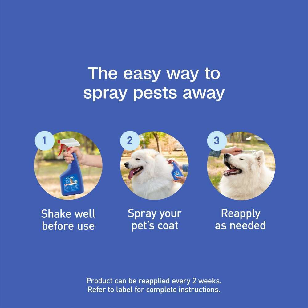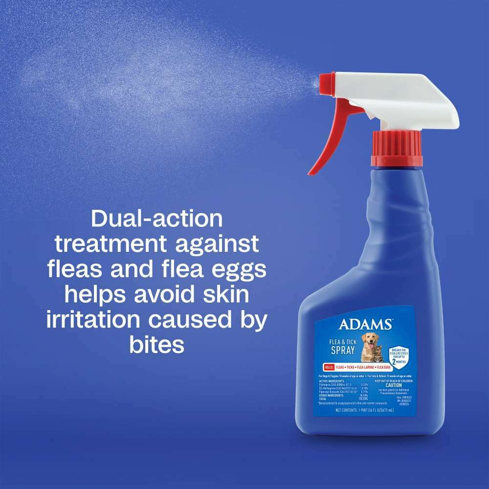 ADAMS Flea & Tick Spray offers the protection you need from the brand you trust. This spray delivers dual-action protection by killing adult fleas and eliminating flea eggs. Adult fleas can cause your pet discomfort and irritation, while their eggs fall off and develop in your home – making elimination of both stages critical. This effective formula also kills ticks, including deer ticks, and provides relief from biting fleas while breaking the flea life cycle for up to 2 months. The easy-to-use trigger bottle makes application quick and convenient. This spray is also fragrance-free and does not leave behind a scent. The best protection you can offer your pet is protecting them and the areas where they live and play. Since only 5% of fleas live on your pet, use this spray with other ADAMS products to protect your pet, home and yard for complete pest control. Since 1975, the people who bring you ADAMS have helped owners confidently care for their pets, ensuring they live happy and healthy lives.