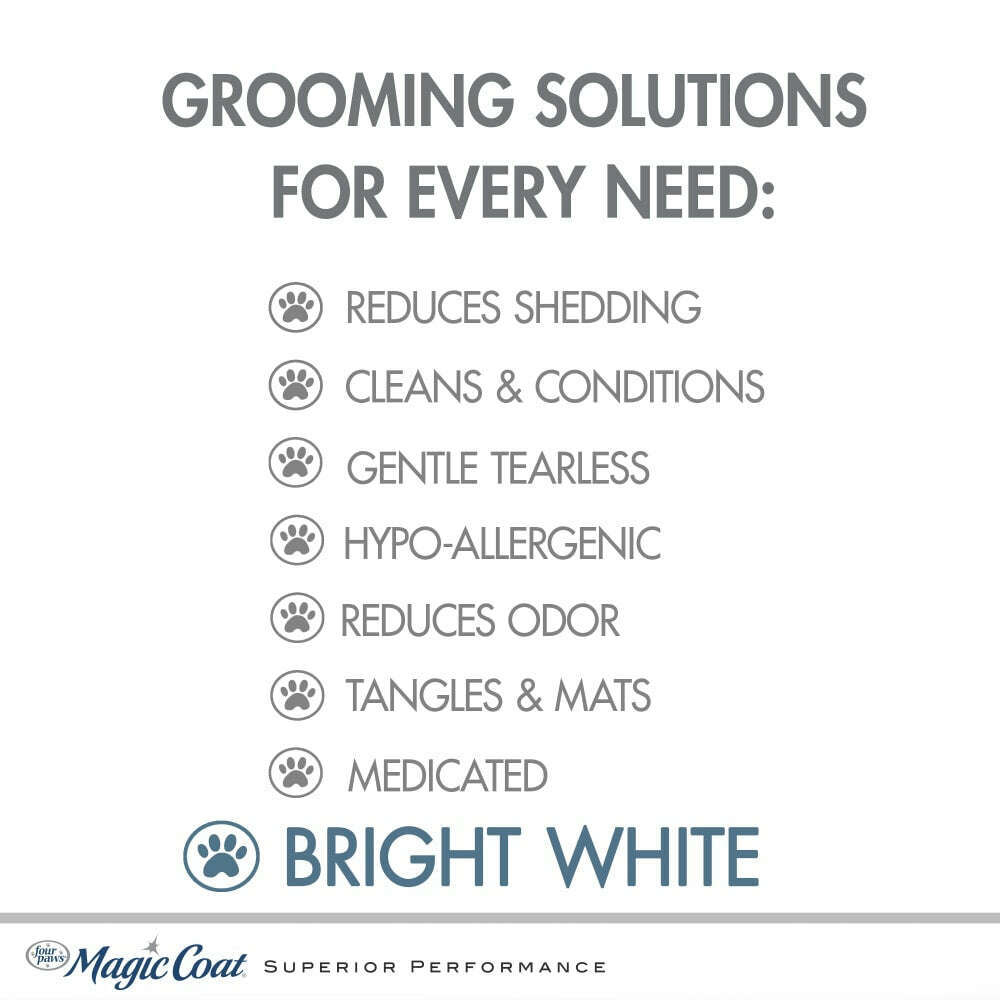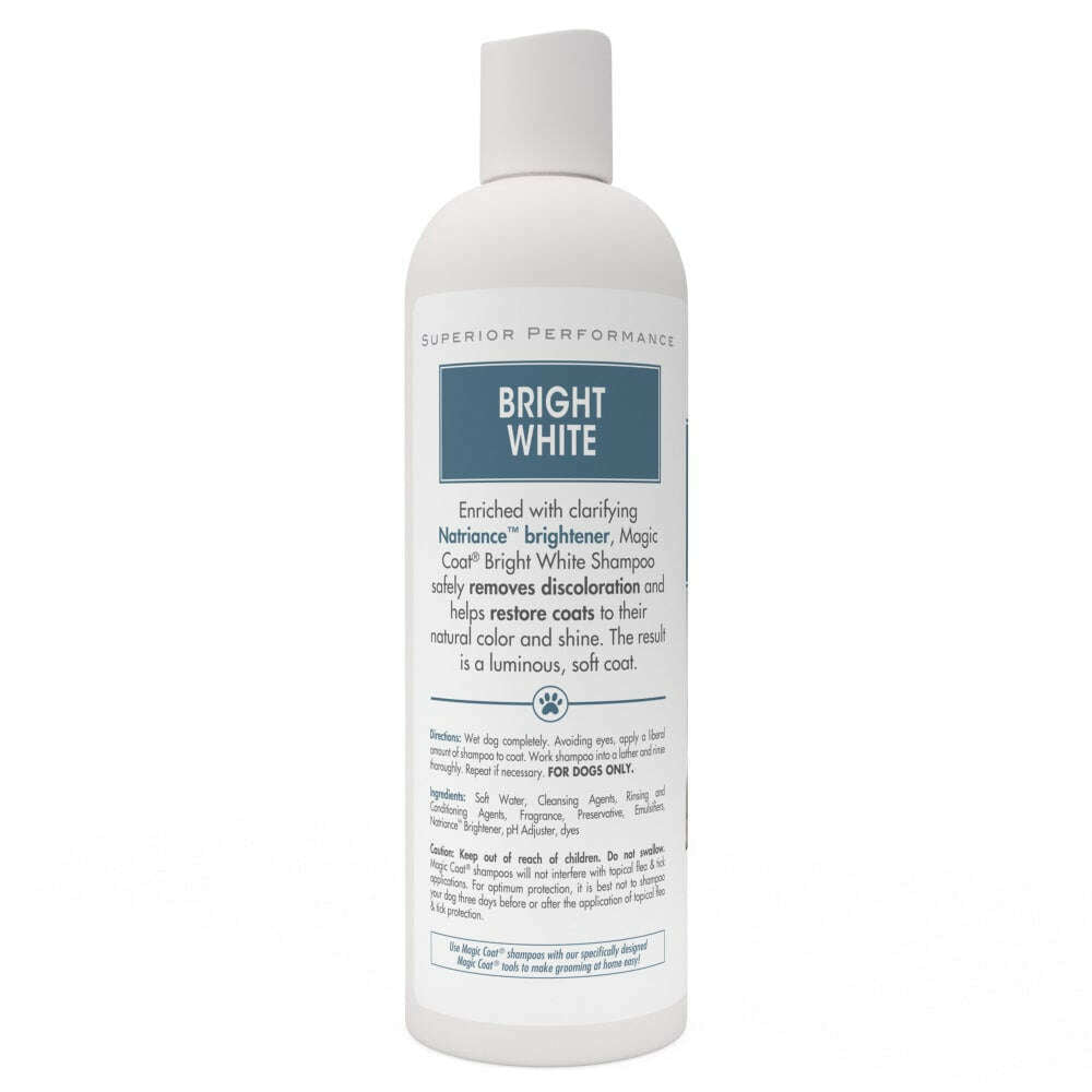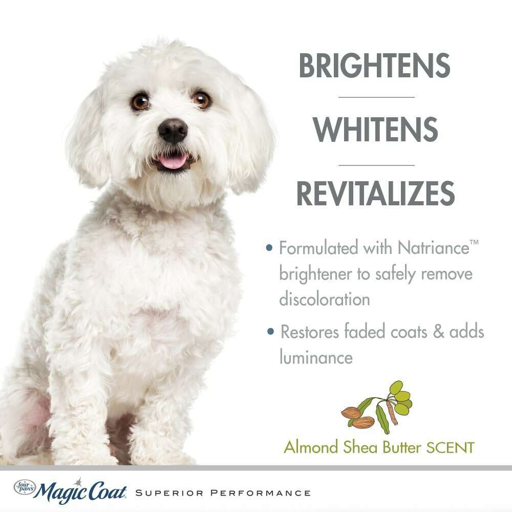 The Magic Coat Bright White Shampoo with clarifying Natriance brightener is paraben-free and adds a more luminous appearance to the coat. Softly scented with almond shea butter, this dog shampoo for white fur safely removes discoloration and restores fading coats to their natural shine.