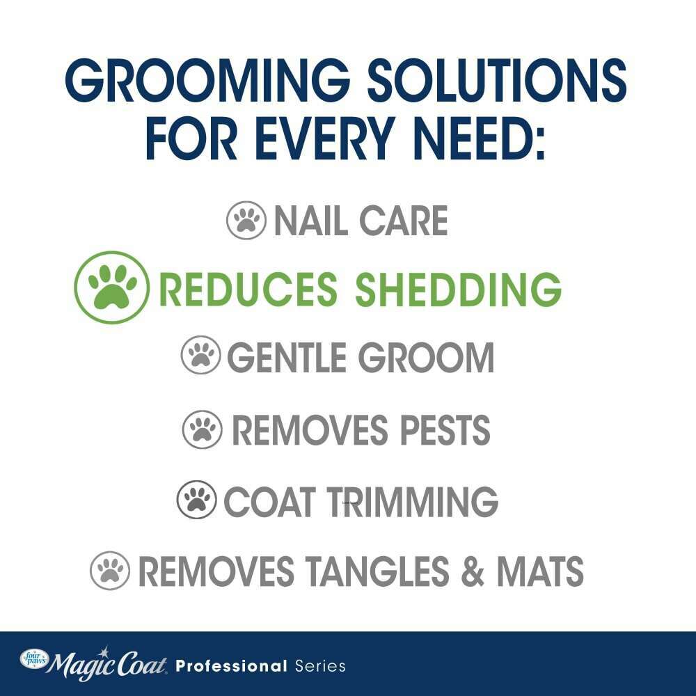The Magic Coat Professional Series features premium multi-purpose pet grooming tools for a salon-like experience right at home. Specially treated to inhibit odors, the Dual-Sided Curry Brush easily removes excess hair, stimulates the coat's natural oils, and offers your dog a therapeutic grooming experience. This versatile solution includes long nubs that deeply clean while the short nubs remove loose hair. The short nubs are also perfect for picking up hair from furniture and clothing! Meanwhile, the flexible silicone on this dog deshedding brush is easy to hold and gently massages your pet's skin. Use it on wet coats during bath time or dry coats to increase shine. This dog curry brush is ideal for short, curly, and wiry coats and can also be used to groom cats!